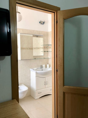 Bagno privato ed esclusivo con ampio box doccia (130 x 70), interno alla camera (ulteriori 3,5 mq). Phon e biancheria.
